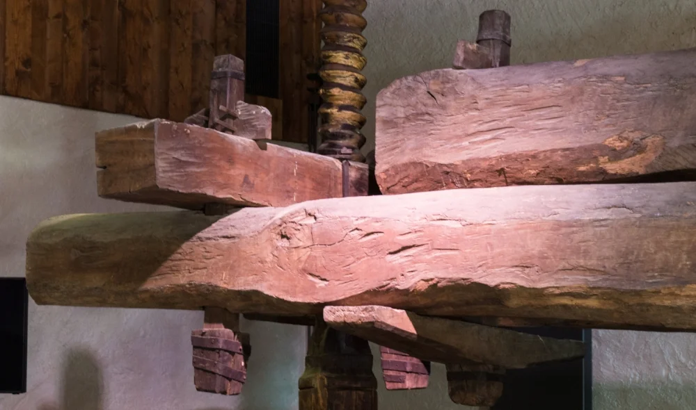 The surface for the projection is a so called "Torkel" a giant winepress inside of the museum. You can see it in the picture below.